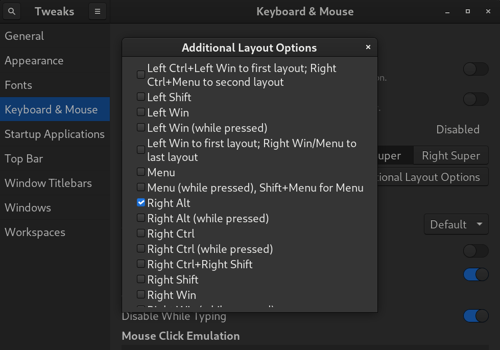 마지막으로 "Tweaks - Keyboard & Mouse - Additional Layout Options - Switching to another layout" 로 가서 'Right Alt'를 체크하자.