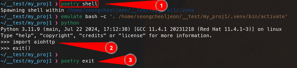 poetry shell로 진입하여 패키지가 잘 설치되었는지 확인할 수 있다.