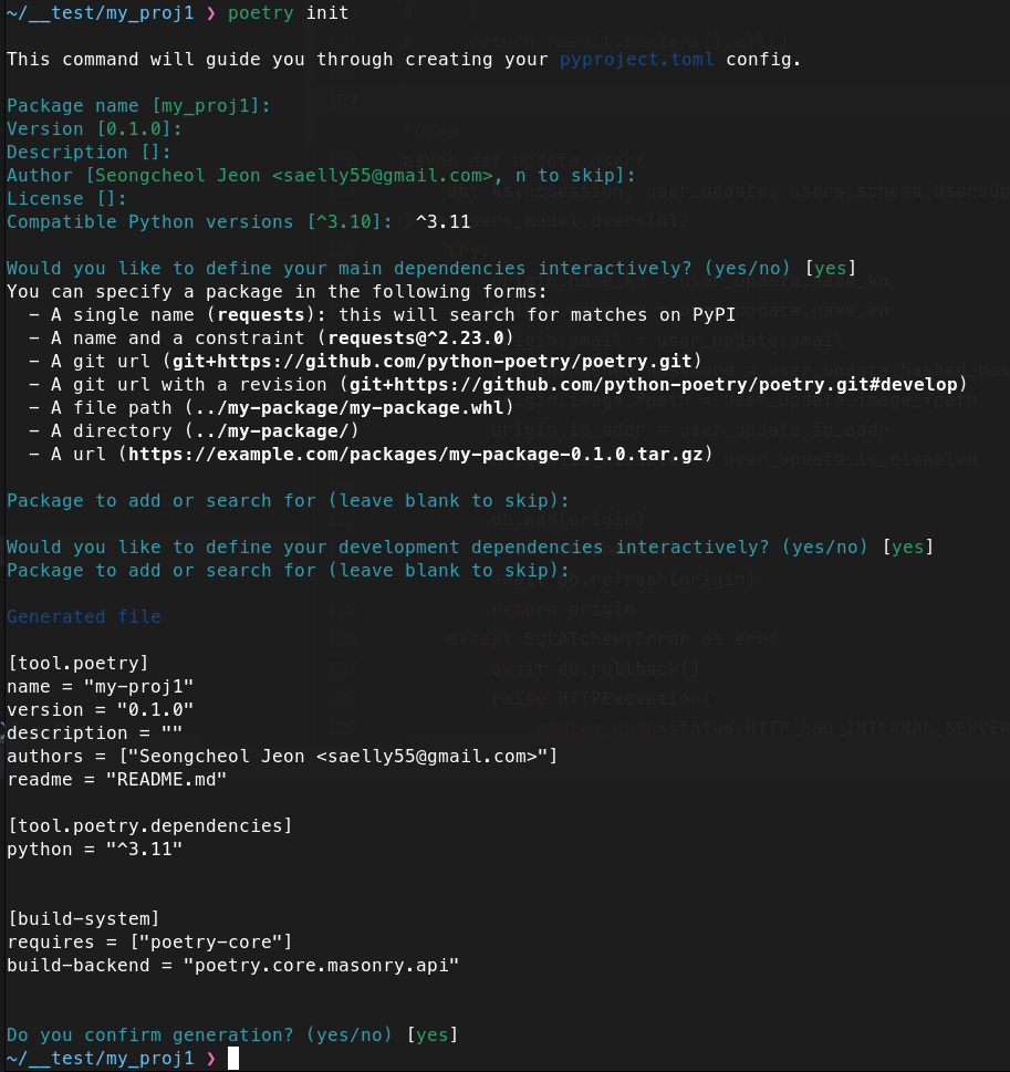 poetry init 명령은 기존 프로젝트를 poetry로 관리하고 싶을 때 사용하면 좋은 명령이다.