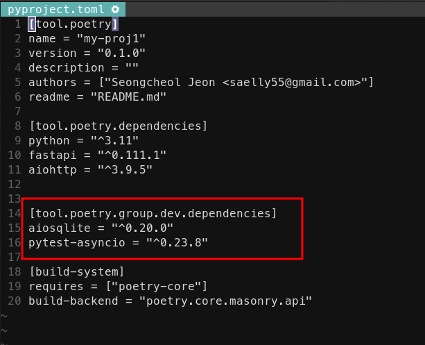 위의 명령을 실행하면 pyproject.toml에 자동을 추가된다.