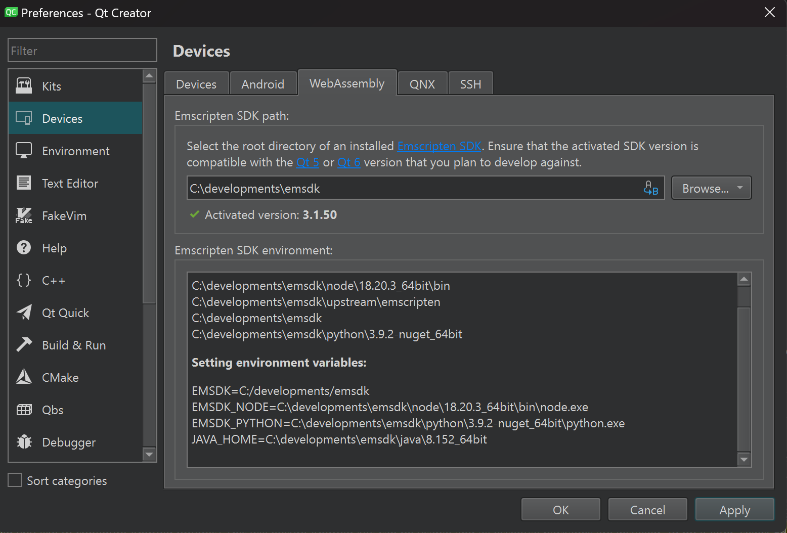 나는 Qt6.7을 설치하면서 Qt를 위한 웹 어셈블리 패키지도 함께 설치하였다. 그래서 WASM SDK를 잡아주어야 한다.