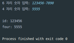 4 자리 숫자 입력은 입력을 받을 기회조차 얻지 못하고 프로그램이 종료되었다. 그 이유는, 6자리 숫자가 입력되고 per_id에 {'1', '2', '3', '4', '5', '6', '\0'} 이렇게 배열에 저장되었을 것이다.