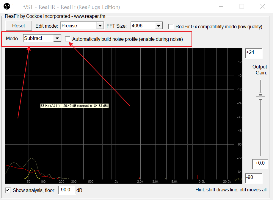 이것을 잡으려면, Mode를 "Subtract" 로 바꿔주고, "Automatically build noise profile (enable during noise)" 체크박스를 체크한다. 그래서 자동으로 잡아준다. 다 잡았으면 체크를 해제하면 끝이다!!!