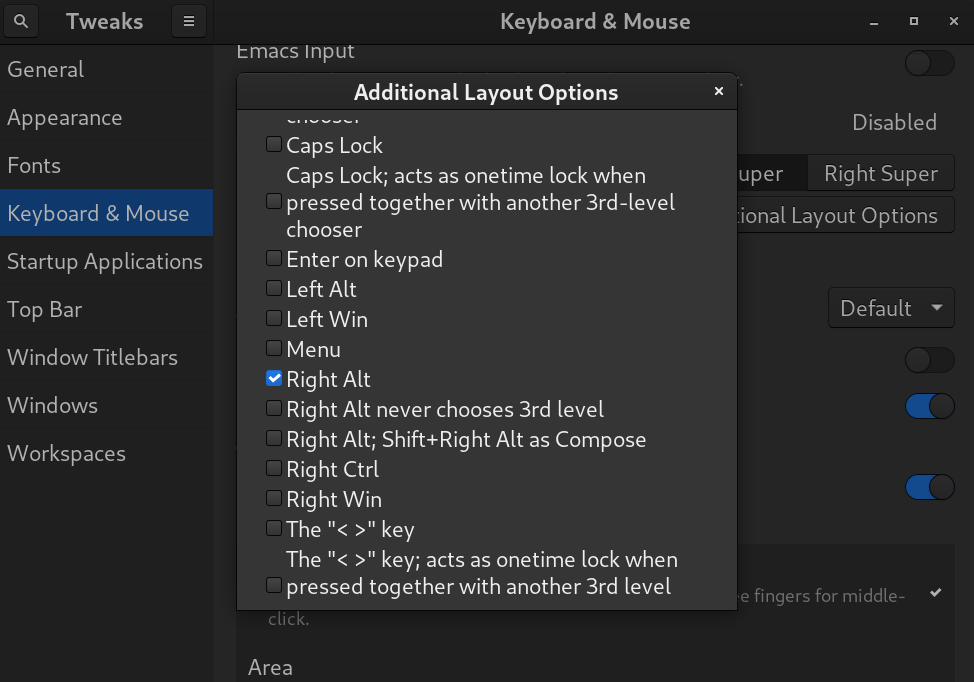 마지막으로 "Tweaks - Keyboard & Mouse - Additional Layout Options - Switching to another layout" 로 가서 'Right Alt'를 체크하자.